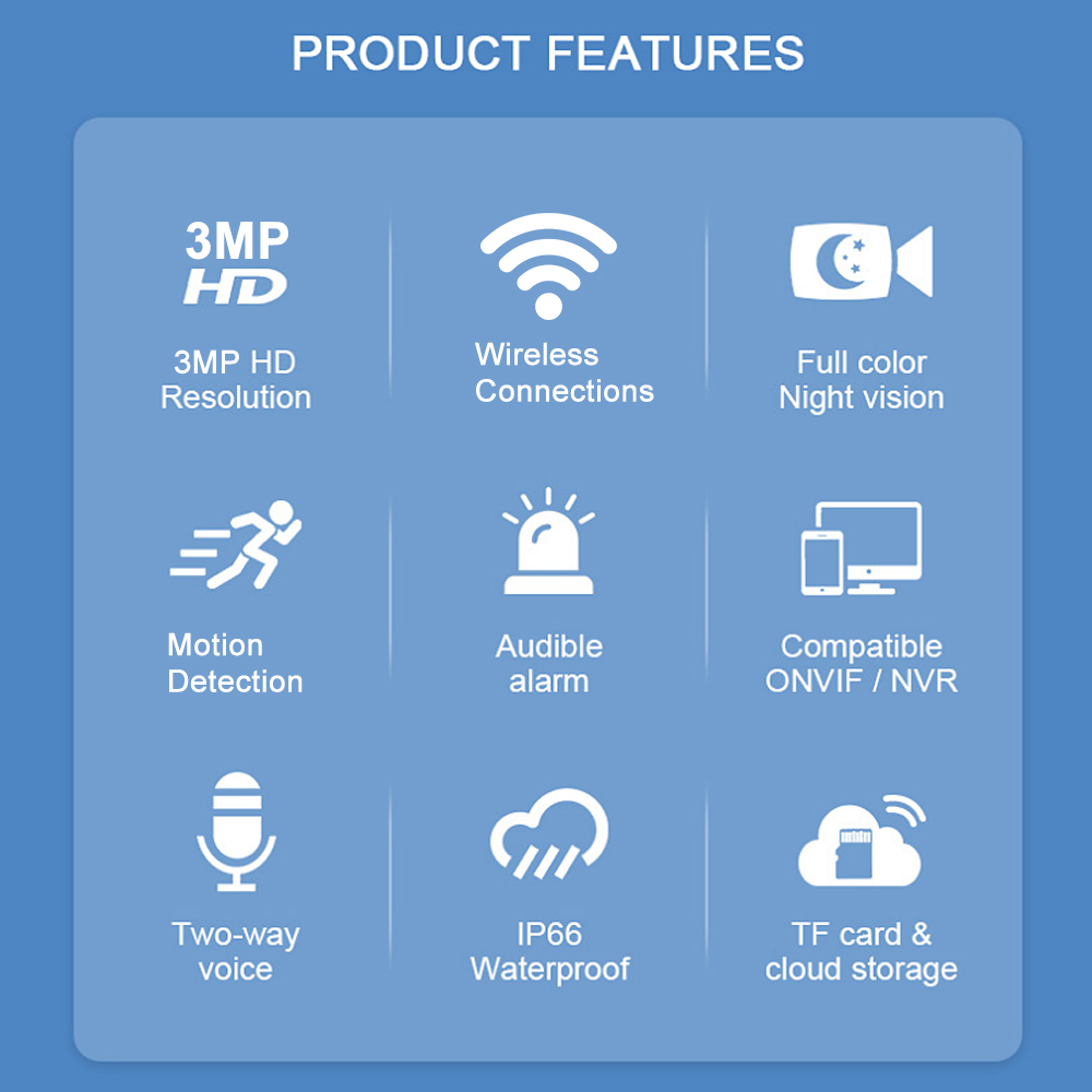 | Storage: | TF Card(Max 128G);Cloud storage /Cloud disk (optional) |